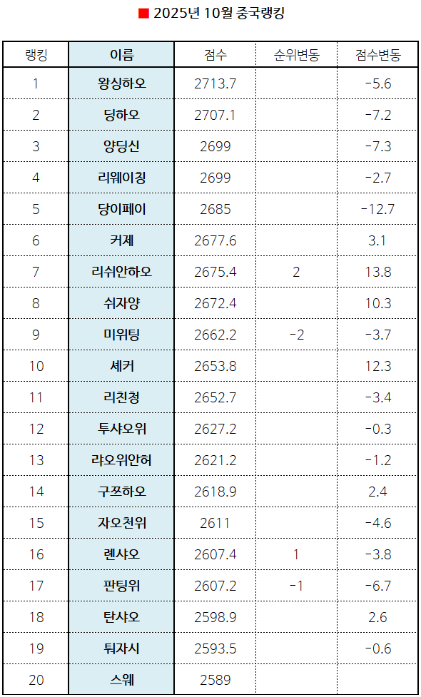 10¿ù Áß±¹·©Å·¿¡¼ ¿Õ½ÌÇÏ¿À°¡ 1À§¸¦ À¯ÁöÇÏ¸ç °³ÀÎ 5¹øÂ° 1À§¸¦ ±â·ÏÇß´Ù. 2À§´Â µùÇÏ¿À, 3À§ ¾çµù½Å, 4À§ ¸®¿þÀÌĪ, 5À§ ´çÀÌÆäÀÌ, 6À§ Ä¿Á¦ ¼øÀÌ´Ù. 1À§ºÎÅÍ 6À§±îÁö Àü¿ù°ú º¯ÇÔÀÌ ¾ø´Ù.