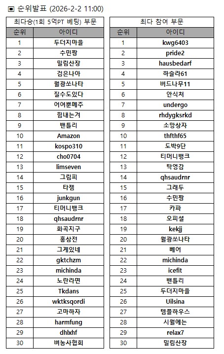 2026³â 2¿ù 2ÀÏ(¿ù) ¿ÀÀü 11½Ã ±âÁØ Áß°£Áý°è ¼øÀ§¸¦ ¹ßÇ¥ÇØµå¸³´Ï´Ù.