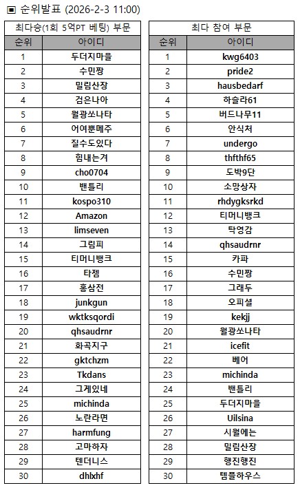 2026³â 2¿ù 3ÀÏ(È) ¿ÀÀü 11½Ã ±âÁØ Áß°£Áý°è ¼øÀ§¸¦ ¹ßÇ¥ÇØµå¸³´Ï´Ù.