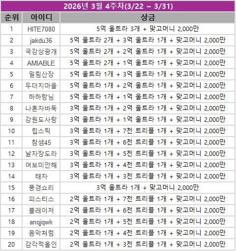 bet ¿ù°£·©Å· 2026³â 3¿ù 4ÁÖÂ÷ ÁÖ°£·©Å· ¼øÀ§ ¹ßÇ¥µå¸³´Ï´Ù.